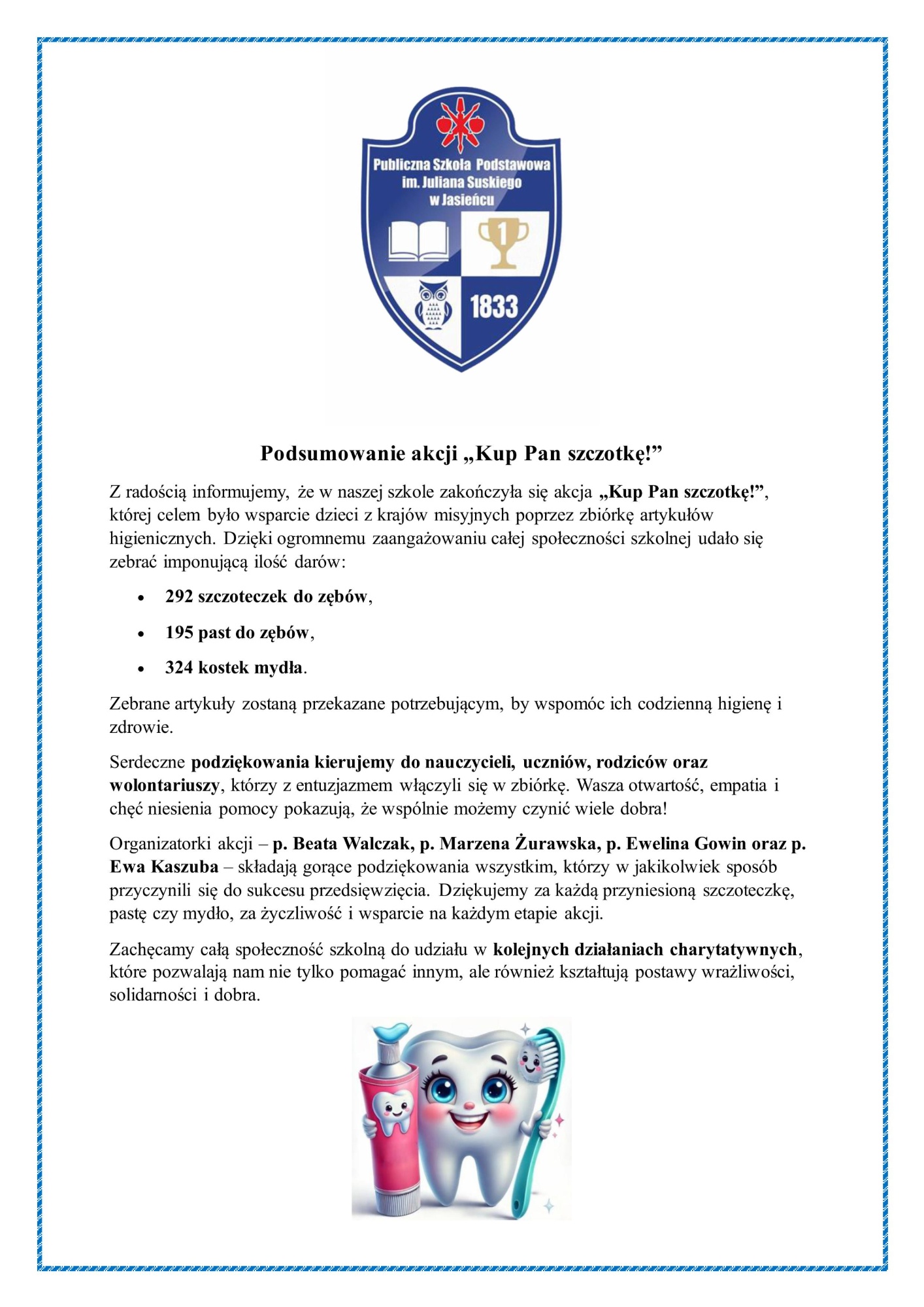 Drodzy Uczniowie, Wasza gotowość do pomocy zwierzętom jest inspirująca. Dziękujemy, że uczycie się, jak ważne jest dzielenie się z innymi i wspieranie tych, którzy potrzebują naszej pomocy. Wasze oddanie sprawie zwierząt pokazuje, jak silna jest Wasza empatia i jak bardzo troszczycie się o dobro innych istot. Jesteście prawdziwymi bohaterami, a wasze dobre serca dodają blasku naszej społeczności szkolnej. Wasza empatia i troska o te bezbronne istoty sprawiły, że ta zbiórka stała się nie tylko sukcesem, ale także wyjątkowym doświadczeniem społecznym. Dziękujemy za Wasze zaangażowanie i otwarte serca. Szanowni Rodzice, Wam również dziękujemy za wsparcie, jakie okazujecie swoim dzieciom w uczestnictwie w takich inicjatywach. Wasza rola jako wzorów empatii i troski o innych jest nieoceniona. Razem tworzymy społeczność pełną dobroci. Wasza rola jako wspierających i edukujących rodziców odegrała kluczową rolę w sukcesie tej zbiórki. Dziękujemy za to, że wspólnie z nami uczycie dzieci wartości empatii i współodczuwania. Jeszcze raz serdecznie dziękujemy każdemu, kto włączył się w tę akcję. Razem pokazaliśmy, że mała inicjatywa może mieć ogromny wpływ. Dziękujemy Wam wszystkim za zaangażowanie, dobroć i chęć niesienia pomocy potrzebującym.
